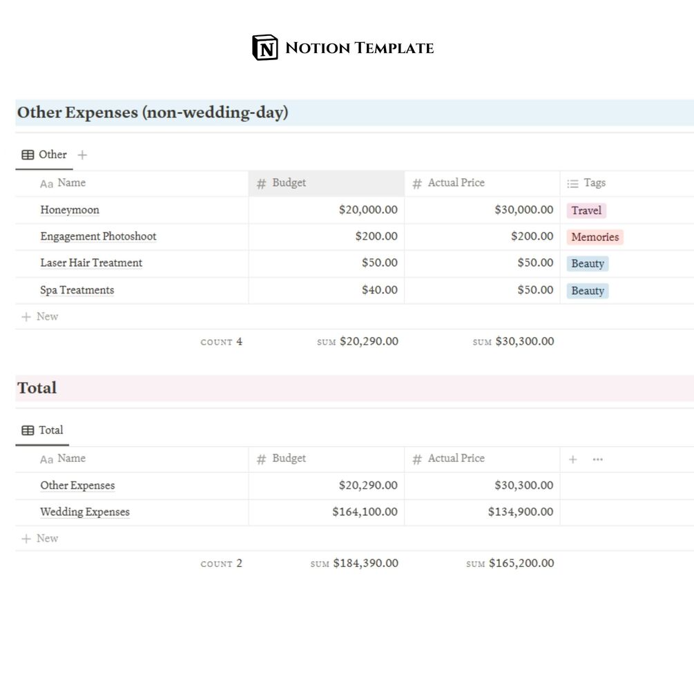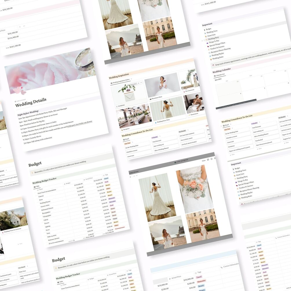 This Notion wedding planning template is a wedding and honeymoon planner designed to make sure you stay on schedule with all aspects of your wedding planning.